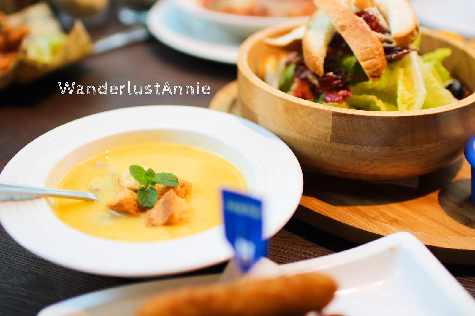 濃湯上面還放了小麵包塊,喝起來還算蠻濃郁的!