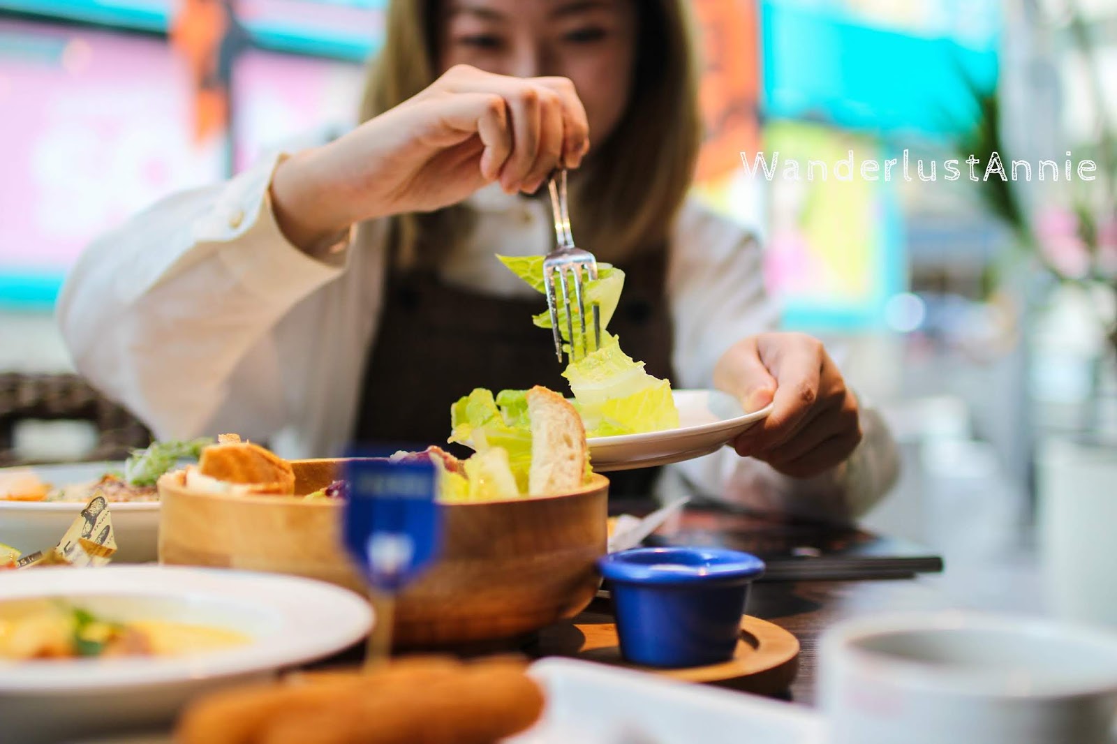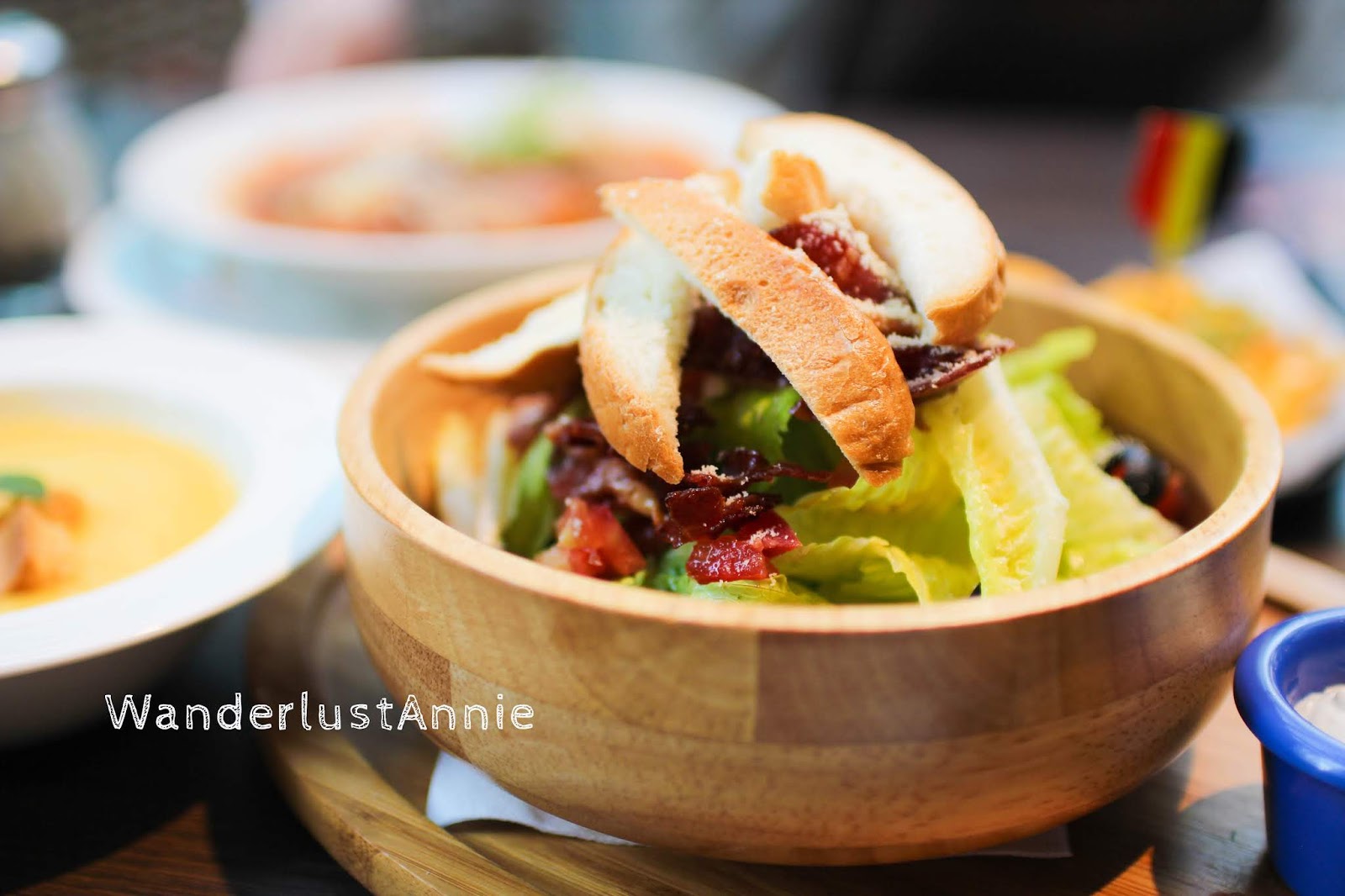 用木盆裝,超大一碗的!除了生菜以外還有大塊麵包與果乾,吃起來相當滿足!
