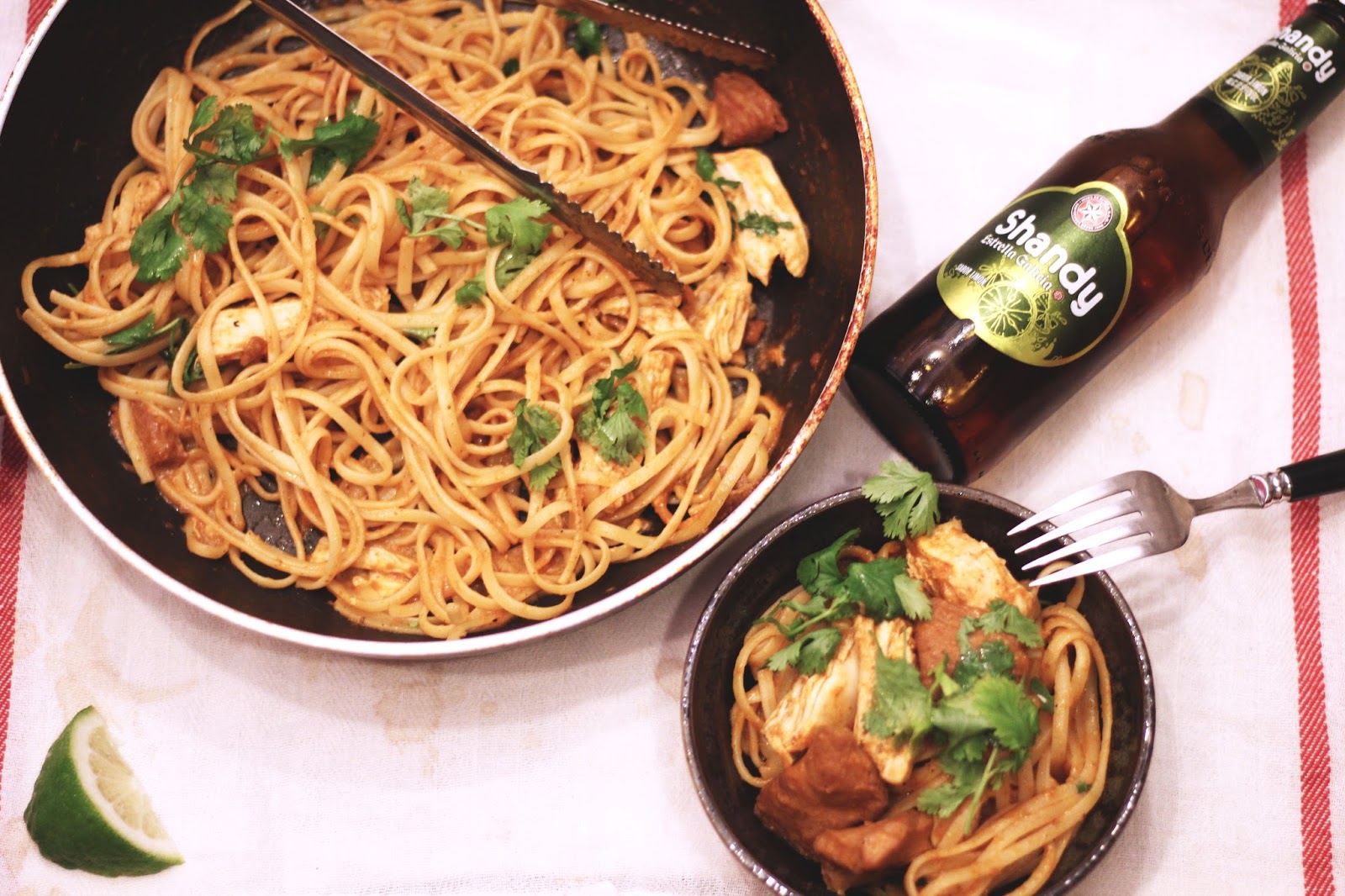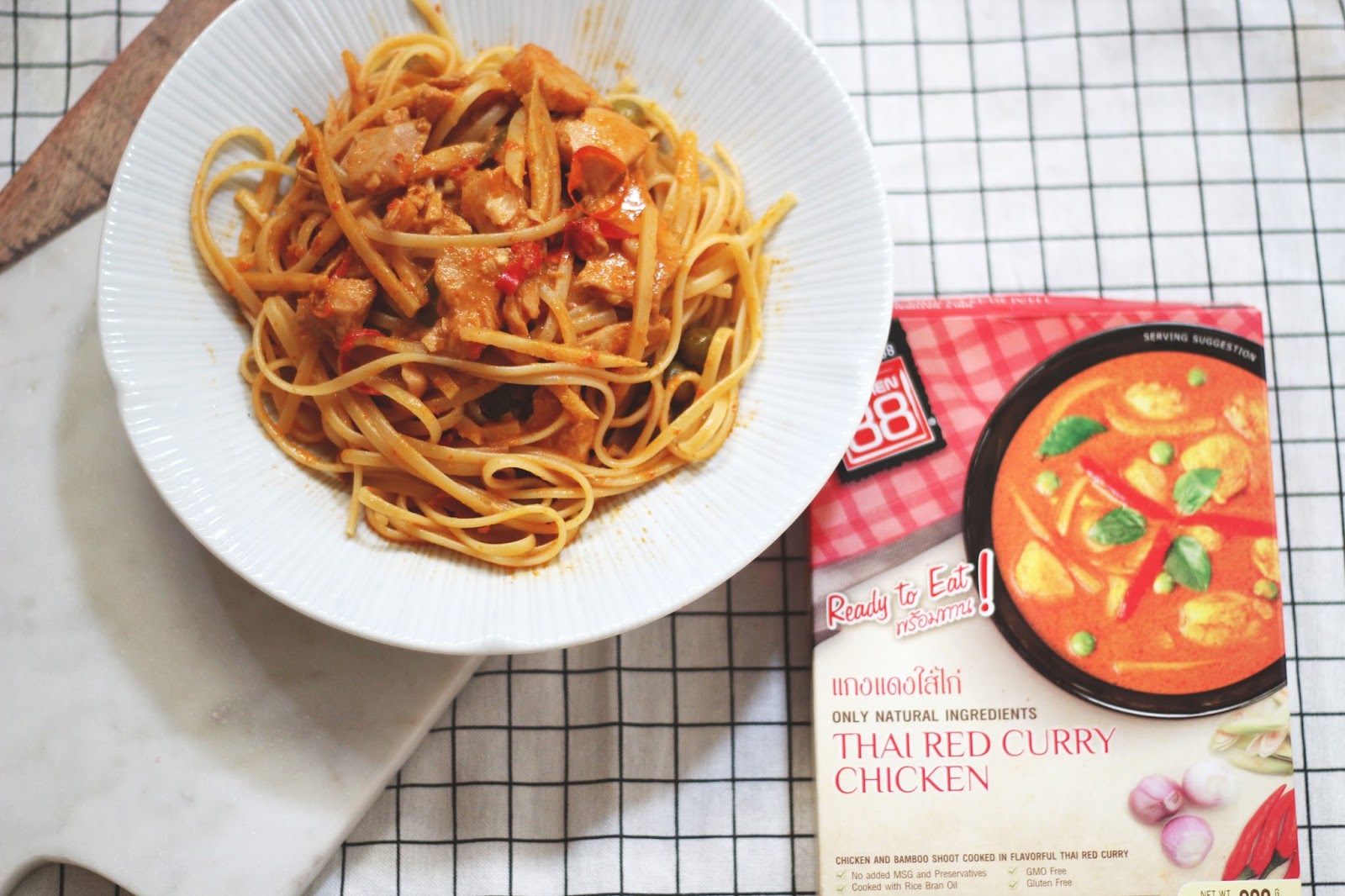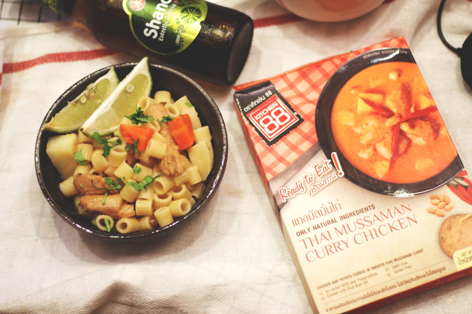 話說充滿醬汁重口味的料理搭戒指麵也不錯喔!我就拿Kitchen 88泰式瑪斯曼咖哩雞做實驗啦!傳統上會搭根莖類一起煮瑪斯曼咖哩,所以我也切了馬鈴薯一起煮,味道意想不到的好吃~而且也不太會辣,所以妹妹又拿出檸檬啤酒做搭配(還一直嚷嚷說還有啤酒嗎?)隔天還給我帶便當去公司~